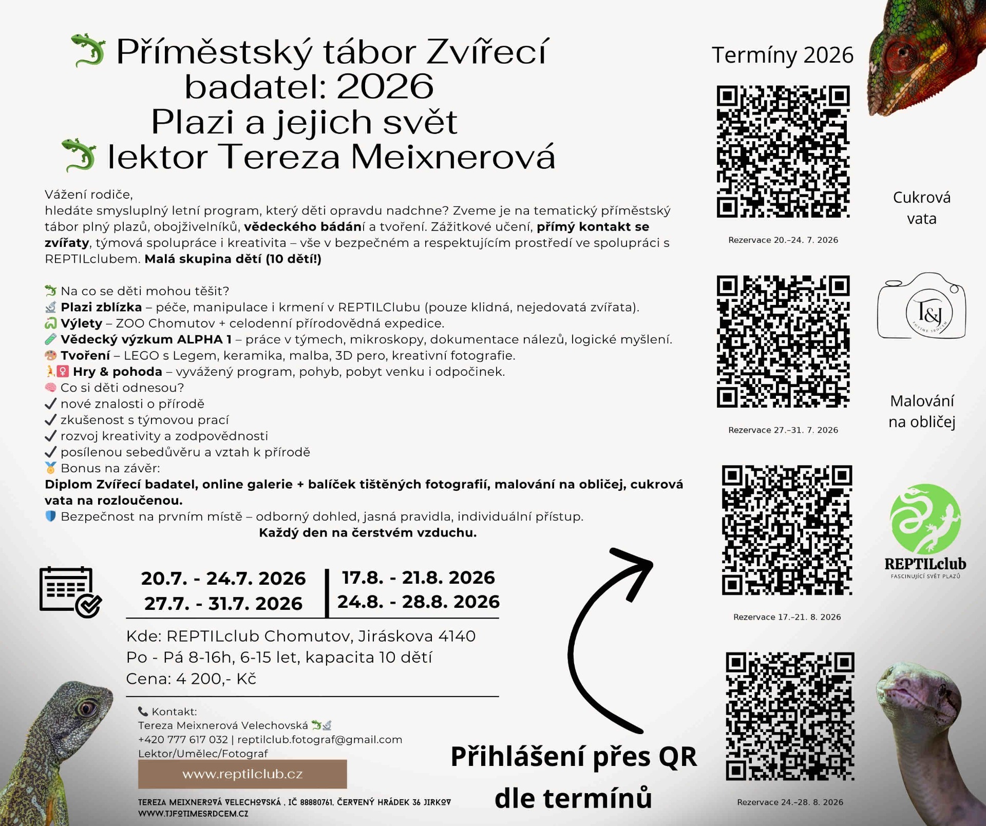 srdečně vás zveme k přihlášení vašich dětí na tematický příměstský tábor zaměřený na svět plazů, obojživelníků, vědecký výzkum a tvořivou činnost. Tábor propojuje zážitkové učení, přímý kontakt se zvířaty, týmovou spolupráci a kreativitu a je koncipován tak, aby byl přínosný jak pro mladší, tak pro starší děti.
